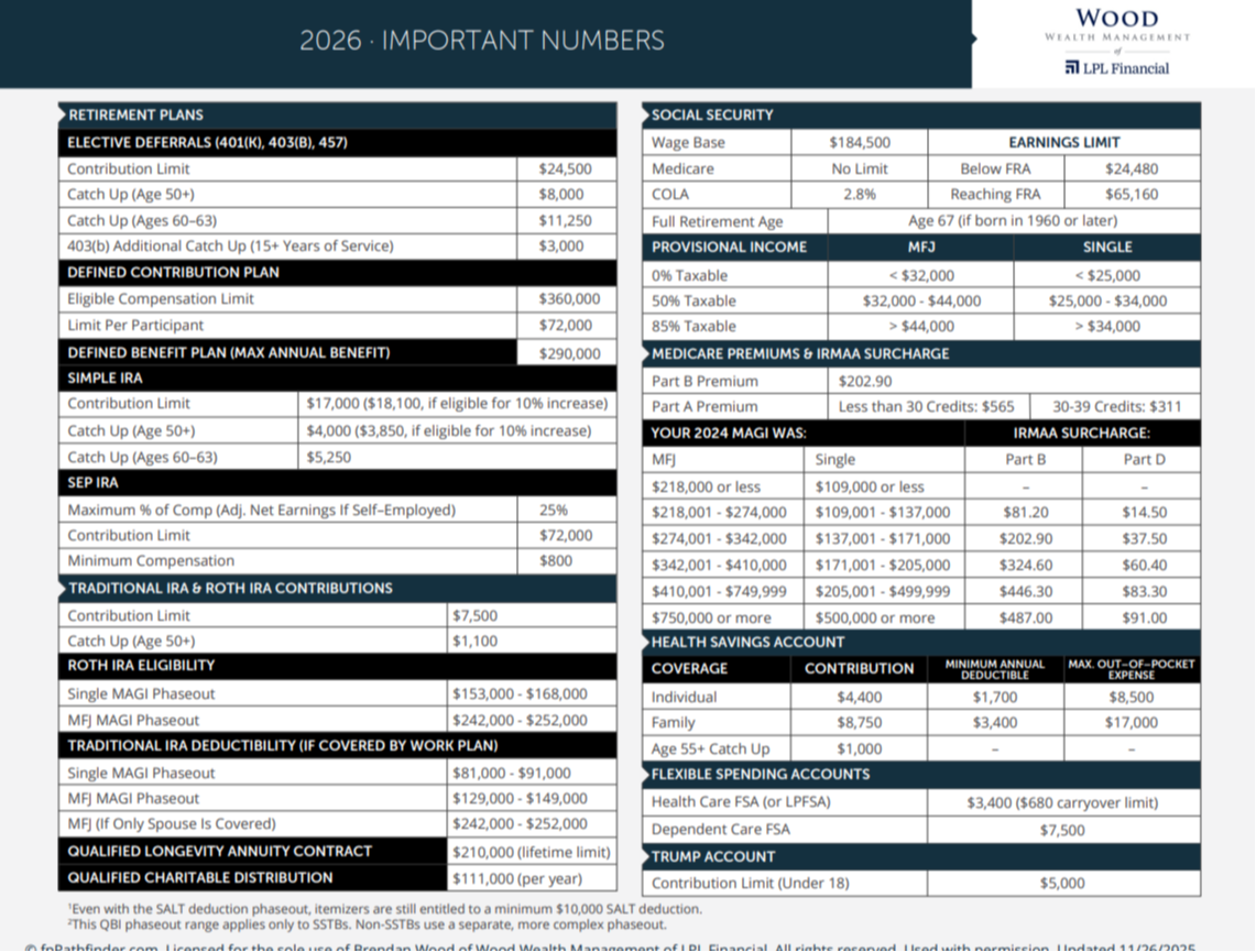 This document provides a helpful snapshot of key tax, retirement, and financial planning limits for 2026. I hope you find it useful as a quick reference when reviewing contributions, planning for retirement, or preparing for tax season.