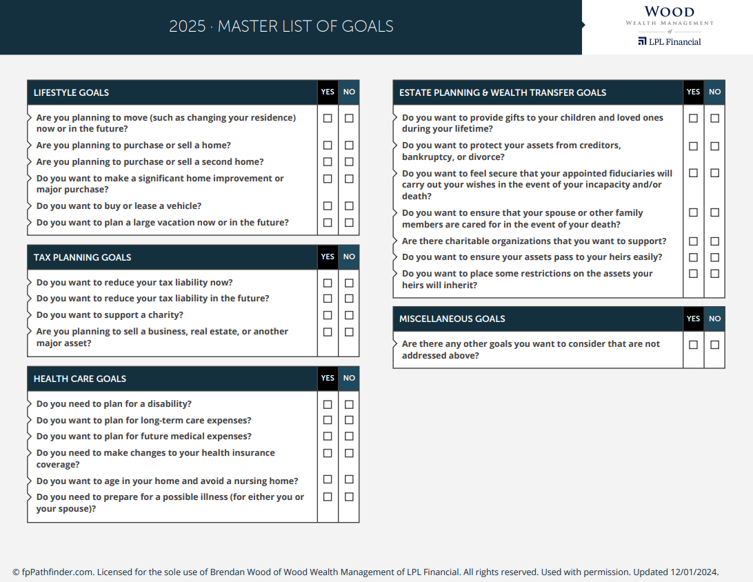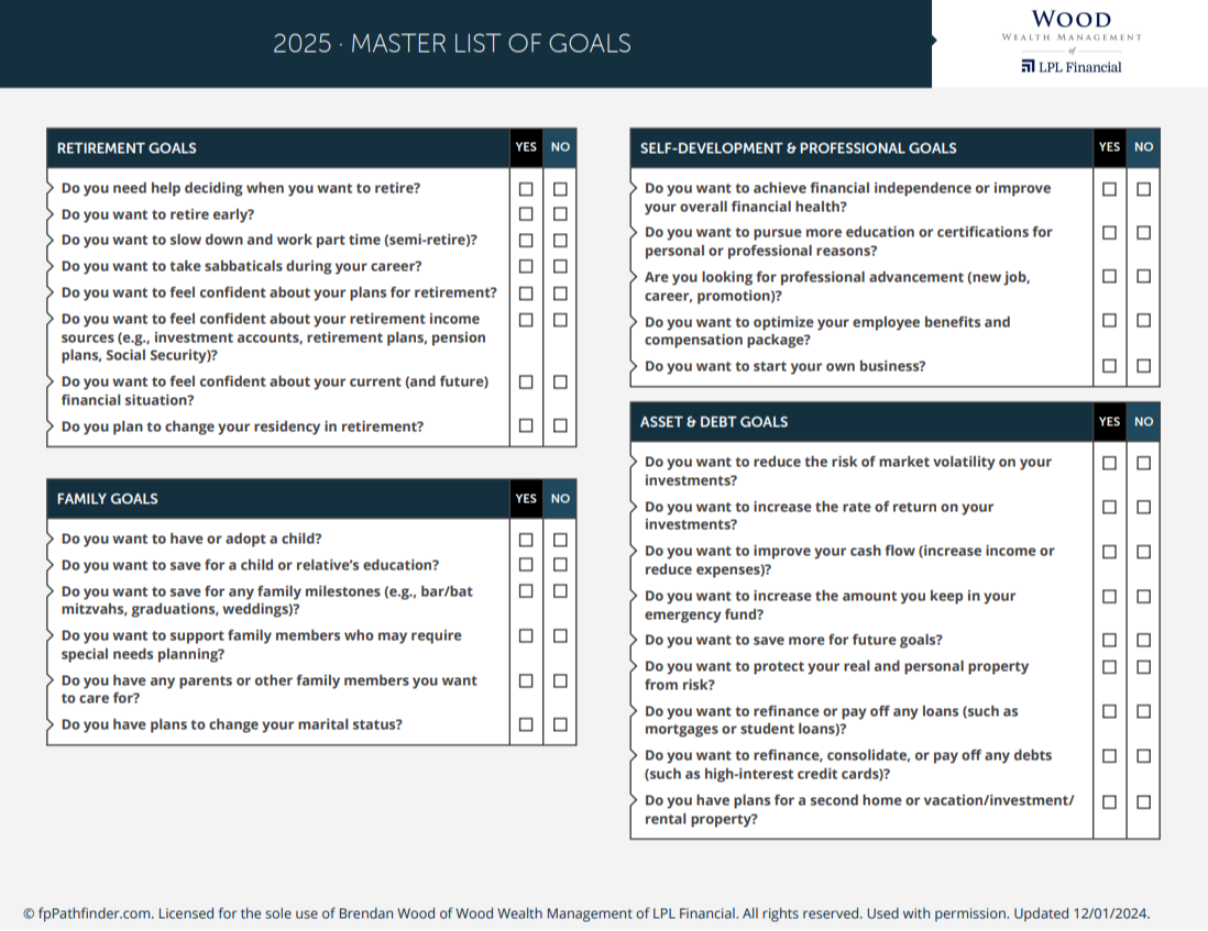 Goal setting is a key part of building a strong financial plan. But just like life, goals can shift, and even small changes can have a big impact on your strategy. To help you reflect on what matters most, explore the checklist below to guide your thinking around retirement and lifestyle, tax and healthcare planning, personal and professional growth, and estate and wealth transfer.
