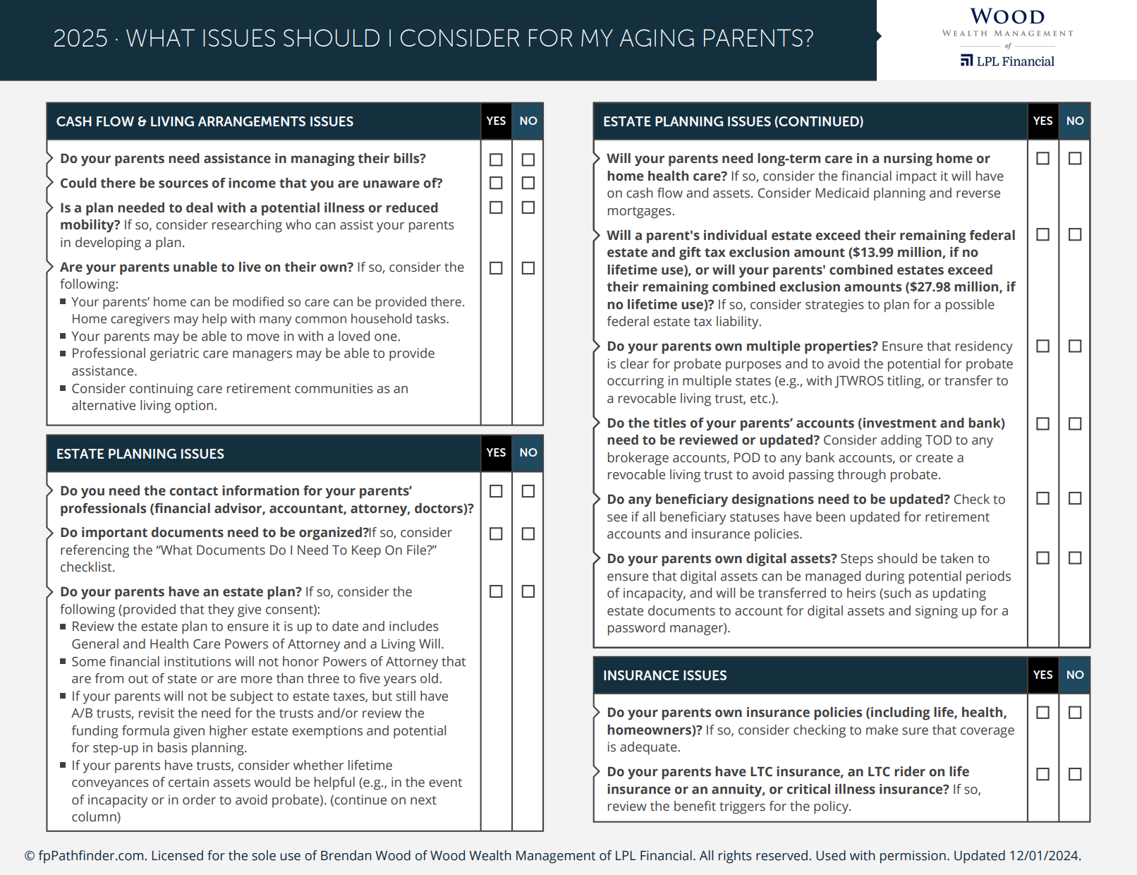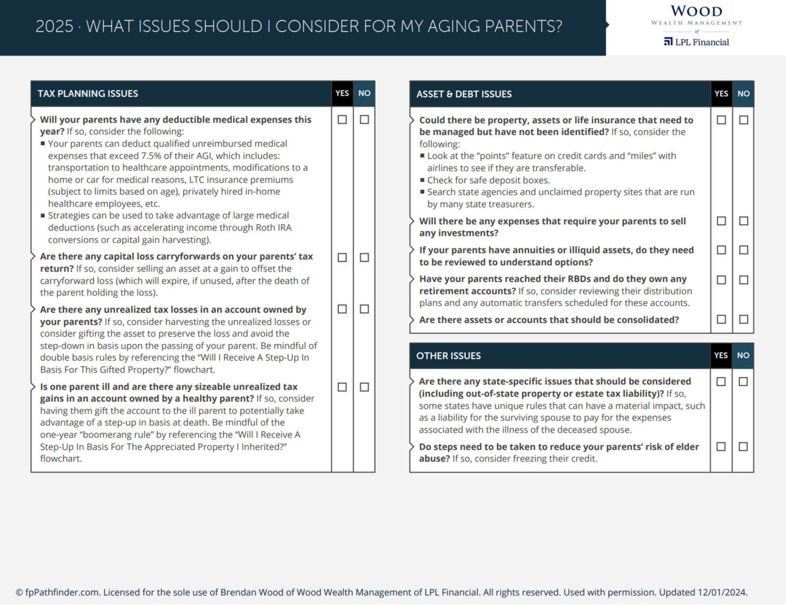Becoming a caregiver for aging parents can be emotionally challenging and financially complex. This checklist highlights important financial issues to consider when supporting aging loved ones. From healthcare costs to estate planning, it’s designed to help you navigate the responsibilities with greater clarity and confidence.